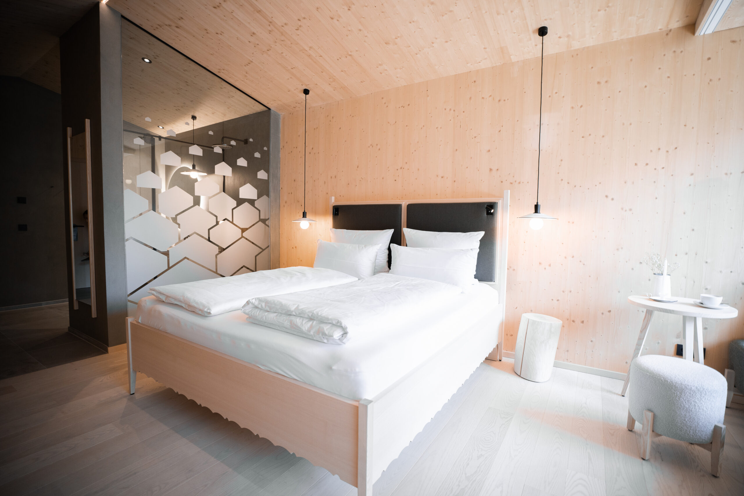 Ein Ort der Ruhe und Geselligkeit, der sich mit hellem Fichtenholz, Emaille- und historischen Trachtelementen stimmungsvoll im Hotel manifestiert. Das an die Umgebung angelehnte Design zieht sich wie ein roter Faden bis in die 53 Zimmer und 37 Suiten. Die Spa-Suiten mit privatem Quellbad, integriertem Dampfbad, Panorama-Badewanne sowie Sauna bieten hier das perfekte Rundumwohlfühlprogramm. Entspannung und erholsamer Schlaf sind ohnehin garantiert, ganz ohne Schäfchen zählen zu müssen.