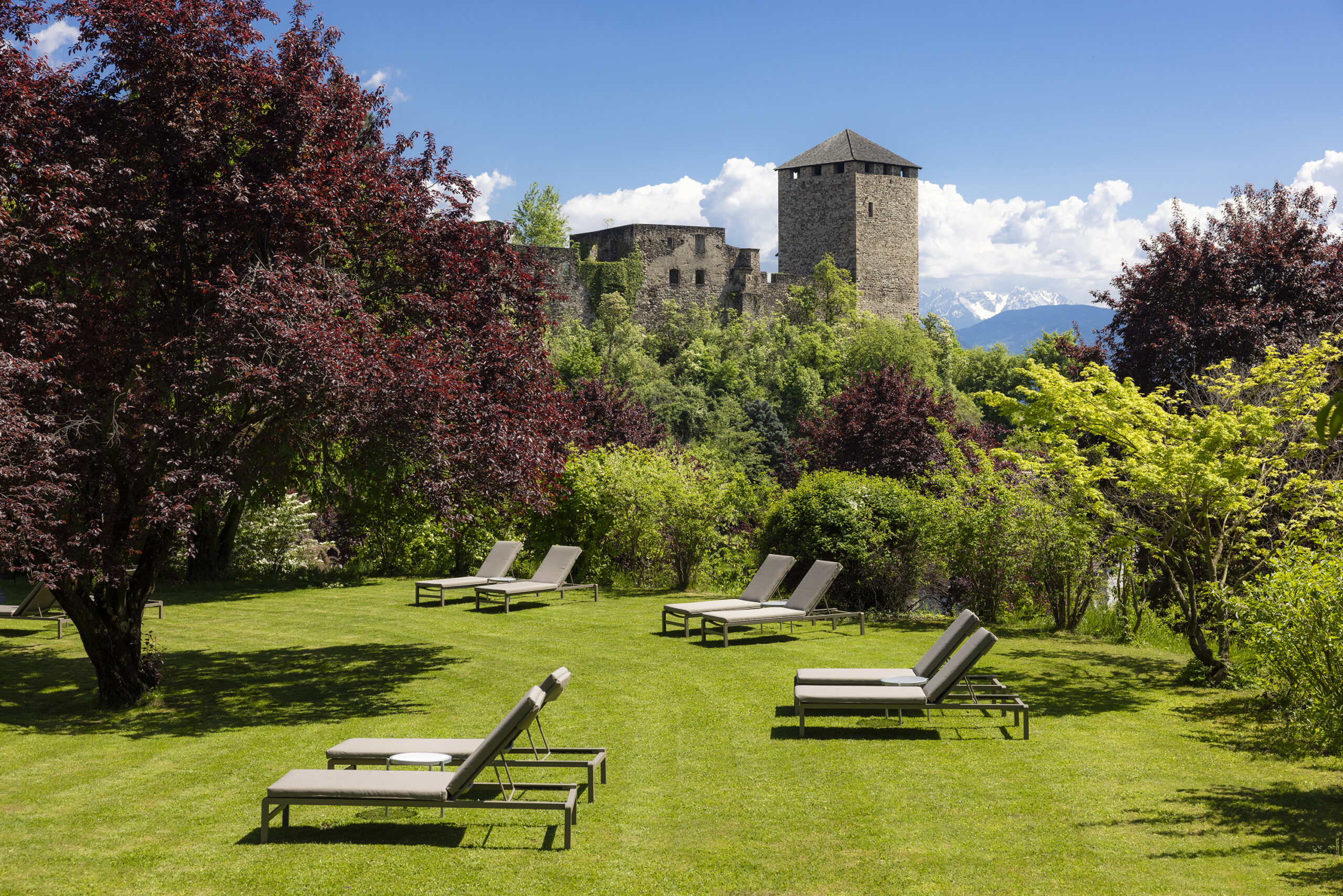 Die Architektur des Hauses greift den Charakter der Landschaft auf: modern, zurückhaltend und stets verwoben mit der Umgebung. Die Burgruine Mayenburg erhebt sich eindrucksvoll direkt vor dem Waldhof. Im architektonisch einzigartigen Infinity-Pool genießt man einen unvergleichlichen Blick auf die Burg, gleichzeitig scheint man über dem Tal zu schweben. Das Waldrefugium, ein im Wald eingebetteter Saunabereich, verbindet Innen und Außen, Stein und Holz, Licht und Schatten. Mehrere Ruheräume bieten hier viel Platz und laden ein, in die Natur einzutauchen. Im dazugehörigen Edelstein-Spa erwartet die Gäste eine der größten Mineraliensammlungen Italiens – und Behandlungen, die ihre urzeitliche Kraft spürbar machen.
